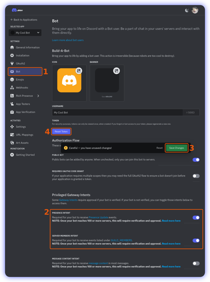 2. Enable the necessary privileged intents outlined, you can also upload the bot's icon and banner, or change its username